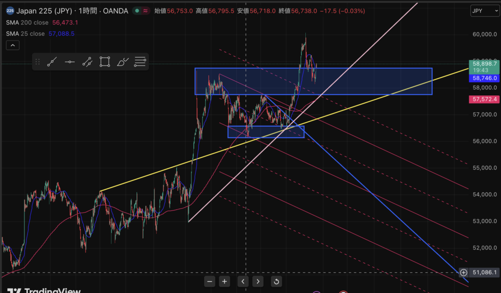 あとは、もう一度高値をくるか。それとも60,000円タッチ(してるよね?)した達成感から一旦の調整で結構下げるか。