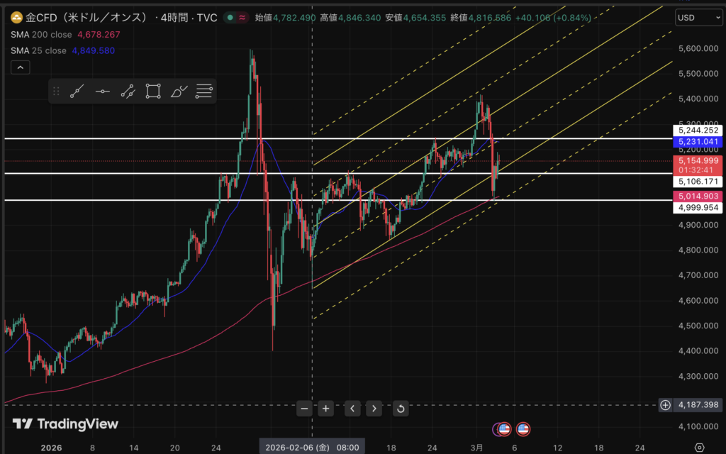 ちなみに、今持ってるポジは握り潰し覚悟で伸ばす。最低でも5300ドルくらいまでは。抜ければトレーリングしながら高音を。