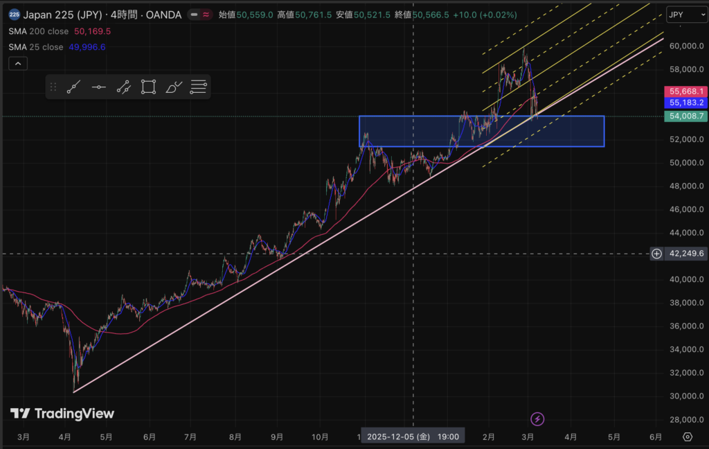 割ったらとりあえず50,000円。もっと行くならターゲットは42,000円のネックライン。