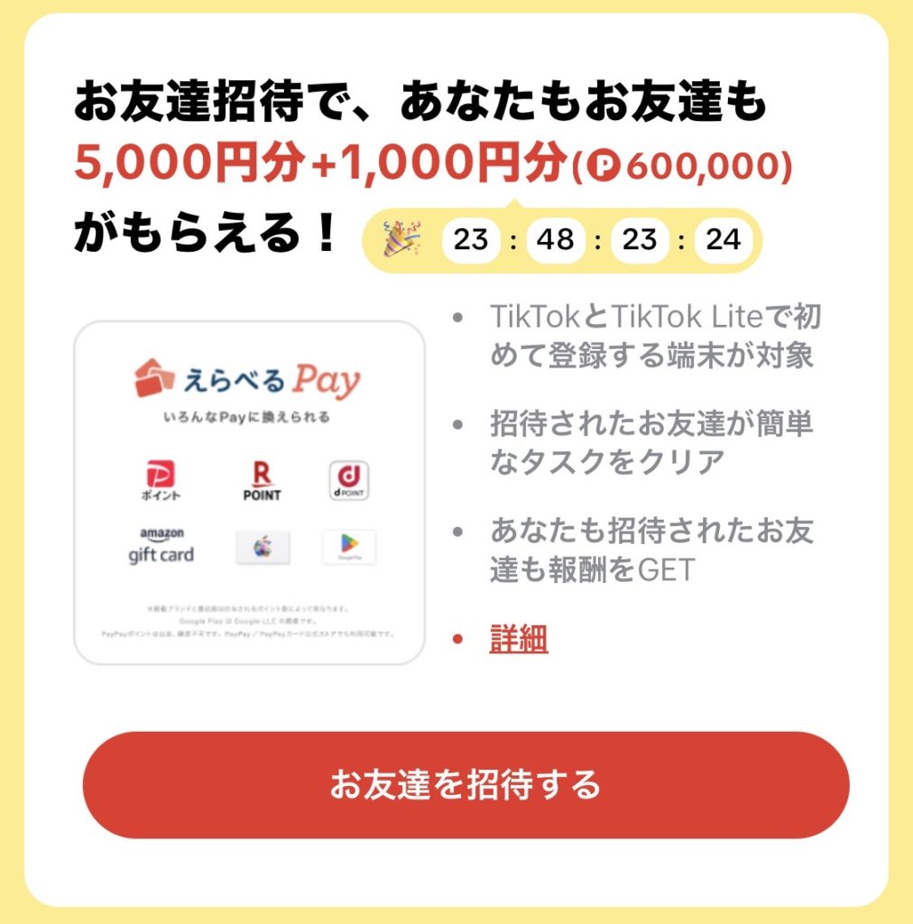 上記とは別に6000円もらえるTIKTOK LITE のキャンペーン。こちらは、新登録に加えて毎日ログインが必要になります。